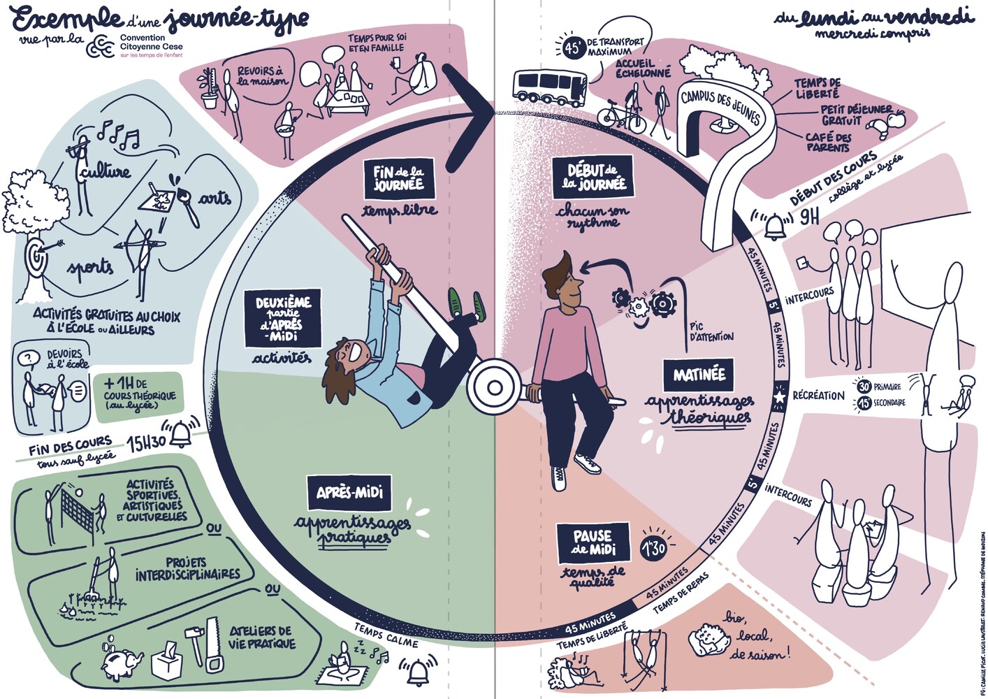 Le rapport de la Convention est issu d’un travail délibératif mené par 133 citoyens tirés au sort. Il a été nourri par des auditions d’experts scientifiques, d’acteurs de terrain mais aussi par la parole directe d’un Panel de 20 jeunes et par une trentaine d’ateliers territoriaux : des ateliers « voix de l’enfant » menés dans des écoles ou centres de loisirs, des ateliers « multipartites » avec les principaux acteurs de l’éducation et des ateliers d’élus qui se déroulés en ligne.